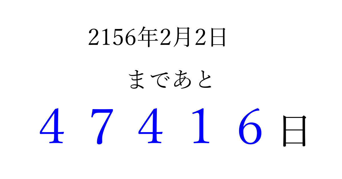 2156年2月2日(月)まで あと 99999 日です 追加すると、トップページからすぐ選べるようになります ※2026/04/08現在の結果です。 最新の状態に更新する ↓シェアして、タイムライン上にカウントダウンを表示しよう!↓ 📤 この結果を共有する Tweet シェア Threads Bluesky 別の日付でカウントダウン 2156年2月のカレンダー このページをブックマークに追加すると、いつでもカウントダウンを確認できます。 (PC: Ctrl+D / Mac: ⌘+D) hitome-notes.comでは以下のページも運営しています。 指定日と期間から日付を計算 | ガチャ確率計算・シミュレーション | プライバシー・ポリシー 運営者:Avocado