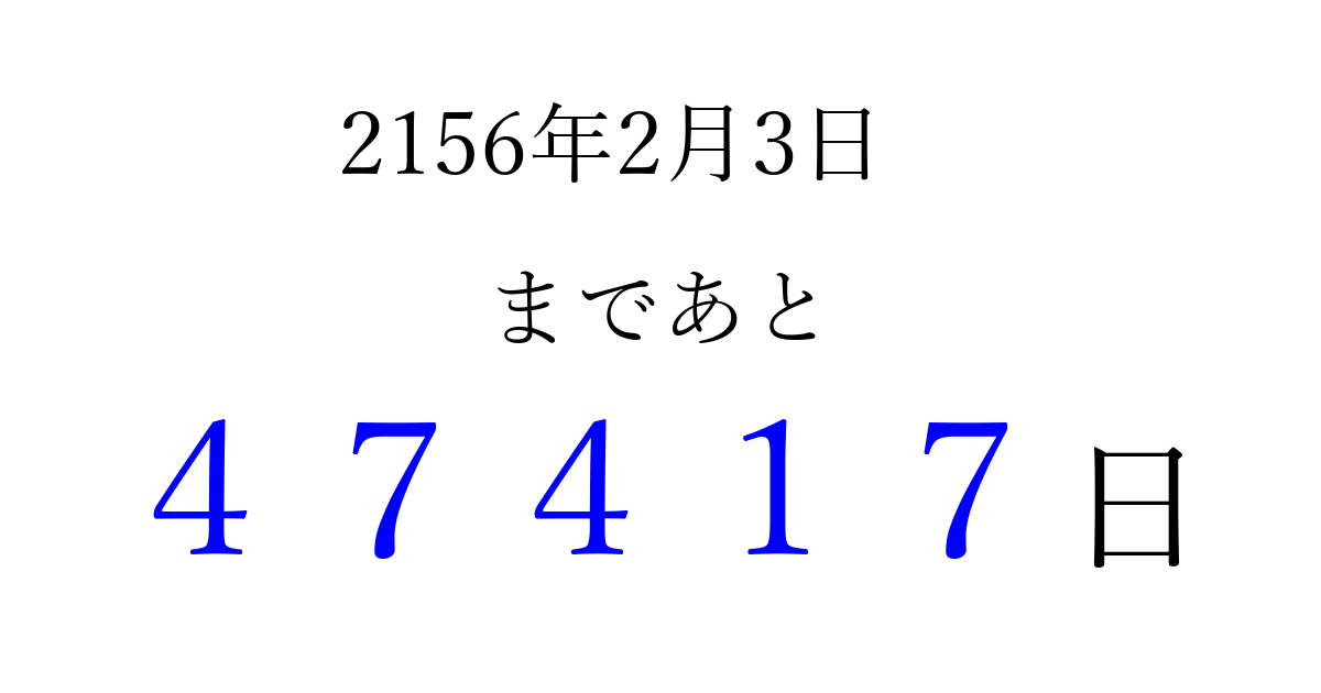 2156年2月3日(火)まで あと 99999 日です 追加すると、トップページからすぐ選べるようになります ※2026/04/08現在の結果です。 最新の状態に更新する ↓シェアして、タイムライン上にカウントダウンを表示しよう!↓ 📤 この結果を共有する Tweet シェア Threads Bluesky 別の日付でカウントダウン 2156年2月のカレンダー このページをブックマークに追加すると、いつでもカウントダウンを確認できます。 (PC: Ctrl+D / Mac: ⌘+D) hitome-notes.comでは以下のページも運営しています。 指定日と期間から日付を計算 | ガチャ確率計算・シミュレーション | プライバシー・ポリシー 運営者:Avocado