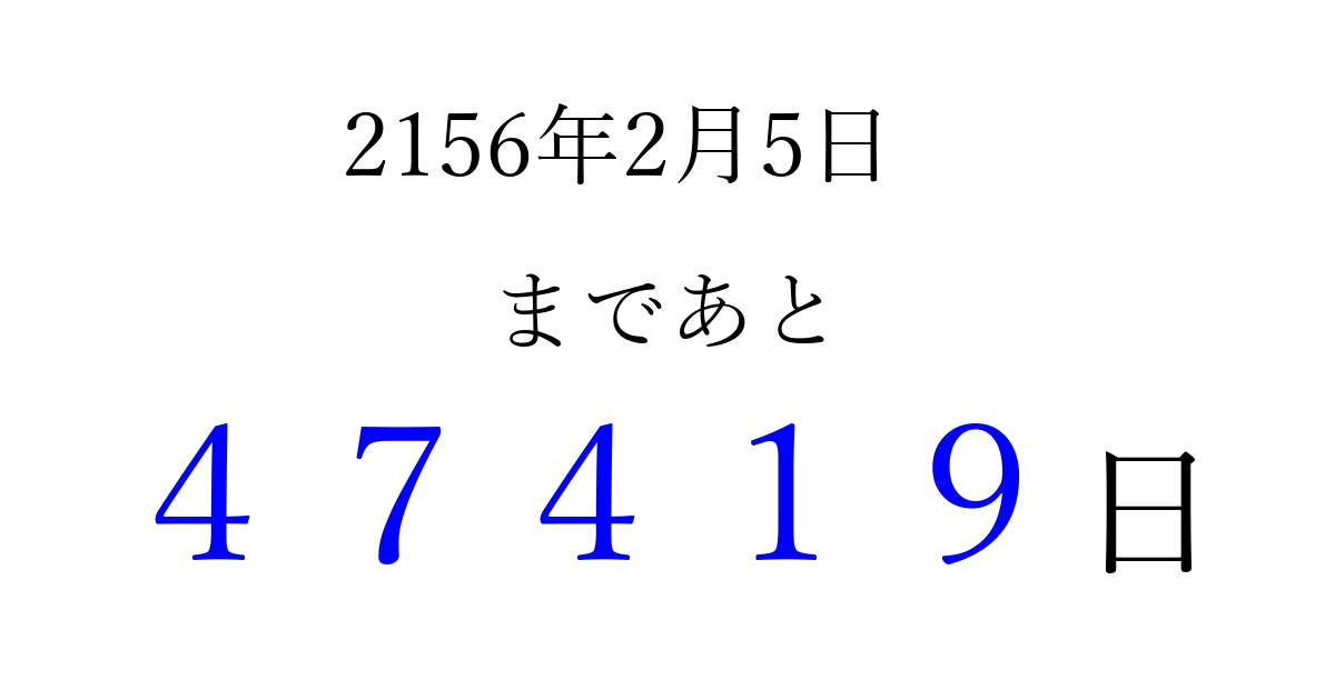 2156年2月5日(木)まで あと 99999 日です 追加すると、トップページからすぐ選べるようになります ※2026/04/08現在の結果です。 最新の状態に更新する ↓シェアして、タイムライン上にカウントダウンを表示しよう!↓ 📤 この結果を共有する Tweet シェア Threads Bluesky 別の日付でカウントダウン 2156年2月のカレンダー このページをブックマークに追加すると、いつでもカウントダウンを確認できます。 (PC: Ctrl+D / Mac: ⌘+D) hitome-notes.comでは以下のページも運営しています。 指定日と期間から日付を計算 | ガチャ確率計算・シミュレーション | プライバシー・ポリシー 運営者:Avocado