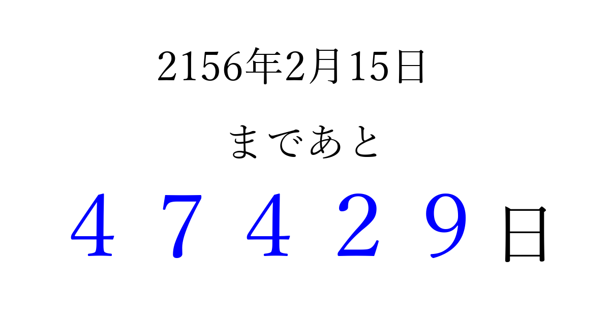 2156年2月15日(日)まで あと 99999 日です 追加すると、トップページからすぐ選べるようになります ※2026/04/08現在の結果です。 最新の状態に更新する ↓シェアして、タイムライン上にカウントダウンを表示しよう!↓ 📤 この結果を共有する Tweet シェア Threads Bluesky 別の日付でカウントダウン 2156年2月のカレンダー このページをブックマークに追加すると、いつでもカウントダウンを確認できます。 (PC: Ctrl+D / Mac: ⌘+D) hitome-notes.comでは以下のページも運営しています。 指定日と期間から日付を計算 | ガチャ確率計算・シミュレーション | プライバシー・ポリシー 運営者:Avocado