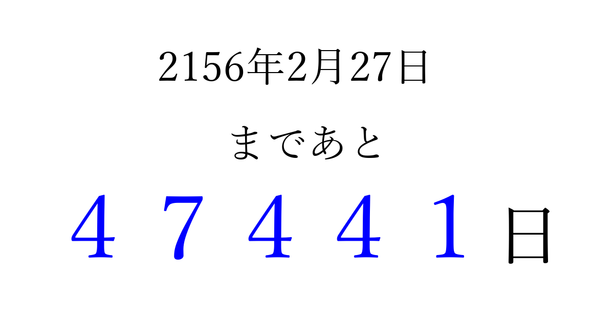2156年2月27日(金)まで あと 99999 日です 追加すると、トップページからすぐ選べるようになります ※2026/04/08現在の結果です。 最新の状態に更新する ↓シェアして、タイムライン上にカウントダウンを表示しよう!↓ 📤 この結果を共有する Tweet シェア Threads Bluesky 別の日付でカウントダウン 2156年2月のカレンダー このページをブックマークに追加すると、いつでもカウントダウンを確認できます。 (PC: Ctrl+D / Mac: ⌘+D) hitome-notes.comでは以下のページも運営しています。 指定日と期間から日付を計算 | ガチャ確率計算・シミュレーション | プライバシー・ポリシー 運営者:Avocado