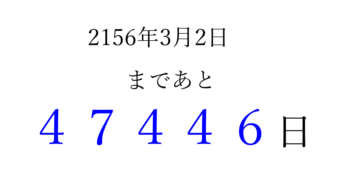 2156年3月2日(火)まで あと 99999 日です 追加すると、トップページからすぐ選べるようになります ※2026/04/07現在の結果です。 最新の状態に更新する ↓シェアして、タイムライン上にカウントダウンを表示しよう!↓ 📤 この結果を共有する Tweet シェア Threads Bluesky 別の日付でカウントダウン 2156年3月のカレンダー このページをブックマークに追加すると、いつでもカウントダウンを確認できます。 (PC: Ctrl+D / Mac: ⌘+D) hitome-notes.comでは以下のページも運営しています。 指定日と期間から日付を計算 | ガチャ確率計算・シミュレーション | プライバシー・ポリシー 運営者:Avocado