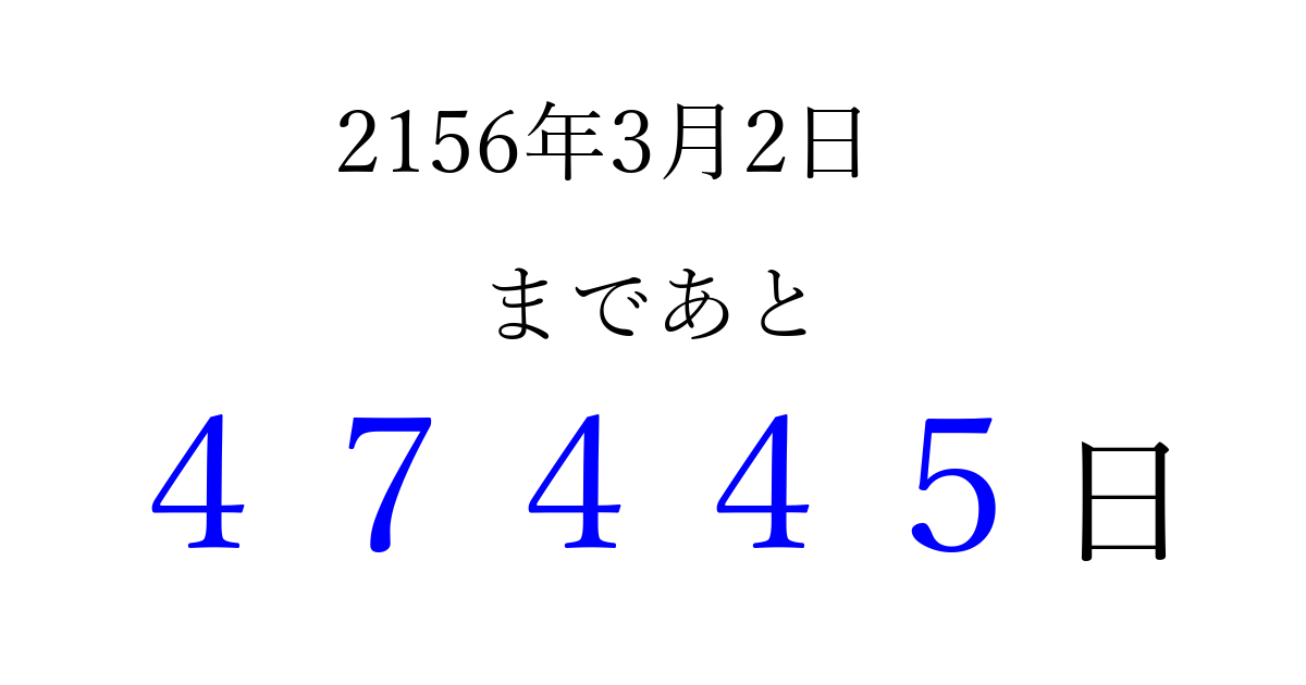 2156年3月2日(火)まで あと 99999 日です 追加すると、トップページからすぐ選べるようになります ※2026/04/08現在の結果です。 最新の状態に更新する ↓シェアして、タイムライン上にカウントダウンを表示しよう!↓ 📤 この結果を共有する Tweet シェア Threads Bluesky 別の日付でカウントダウン 2156年3月のカレンダー このページをブックマークに追加すると、いつでもカウントダウンを確認できます。 (PC: Ctrl+D / Mac: ⌘+D) hitome-notes.comでは以下のページも運営しています。 指定日と期間から日付を計算 | ガチャ確率計算・シミュレーション | プライバシー・ポリシー 運営者:Avocado