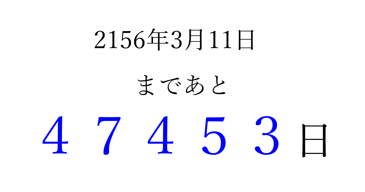 2156年3月11日(木)まで あと 99999 日です 追加すると、トップページからすぐ選べるようになります ※2026/04/09現在の結果です。 最新の状態に更新する ↓シェアして、タイムライン上にカウントダウンを表示しよう!↓ 📤 この結果を共有する Tweet シェア Threads Bluesky 別の日付でカウントダウン 2156年3月のカレンダー このページをブックマークに追加すると、いつでもカウントダウンを確認できます。 (PC: Ctrl+D / Mac: ⌘+D) hitome-notes.comでは以下のページも運営しています。 指定日と期間から日付を計算 | ガチャ確率計算・シミュレーション | プライバシー・ポリシー 運営者:Avocado