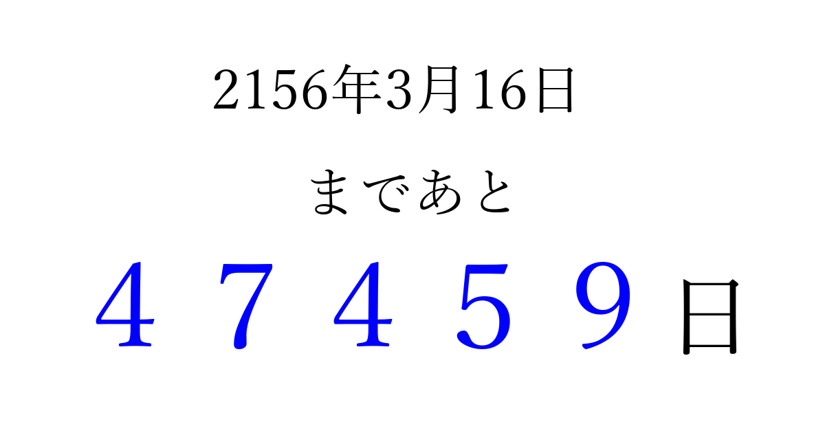 2156年3月16日(火)まで あと 99999 日です 追加すると、トップページからすぐ選べるようになります ※2026/04/08現在の結果です。 最新の状態に更新する ↓シェアして、タイムライン上にカウントダウンを表示しよう!↓ 📤 この結果を共有する Tweet シェア Threads Bluesky 別の日付でカウントダウン 2156年3月のカレンダー このページをブックマークに追加すると、いつでもカウントダウンを確認できます。 (PC: Ctrl+D / Mac: ⌘+D) hitome-notes.comでは以下のページも運営しています。 指定日と期間から日付を計算 | ガチャ確率計算・シミュレーション | プライバシー・ポリシー 運営者:Avocado