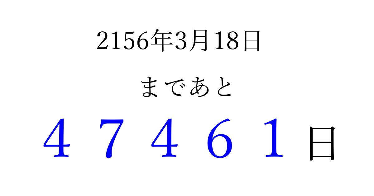 2156年3月18日(木)まで あと 99999 日です 追加すると、トップページからすぐ選べるようになります ※2026/04/08現在の結果です。 最新の状態に更新する ↓シェアして、タイムライン上にカウントダウンを表示しよう!↓ 📤 この結果を共有する Tweet シェア Threads Bluesky 別の日付でカウントダウン 2156年3月のカレンダー このページをブックマークに追加すると、いつでもカウントダウンを確認できます。 (PC: Ctrl+D / Mac: ⌘+D) hitome-notes.comでは以下のページも運営しています。 指定日と期間から日付を計算 | ガチャ確率計算・シミュレーション | プライバシー・ポリシー 運営者:Avocado