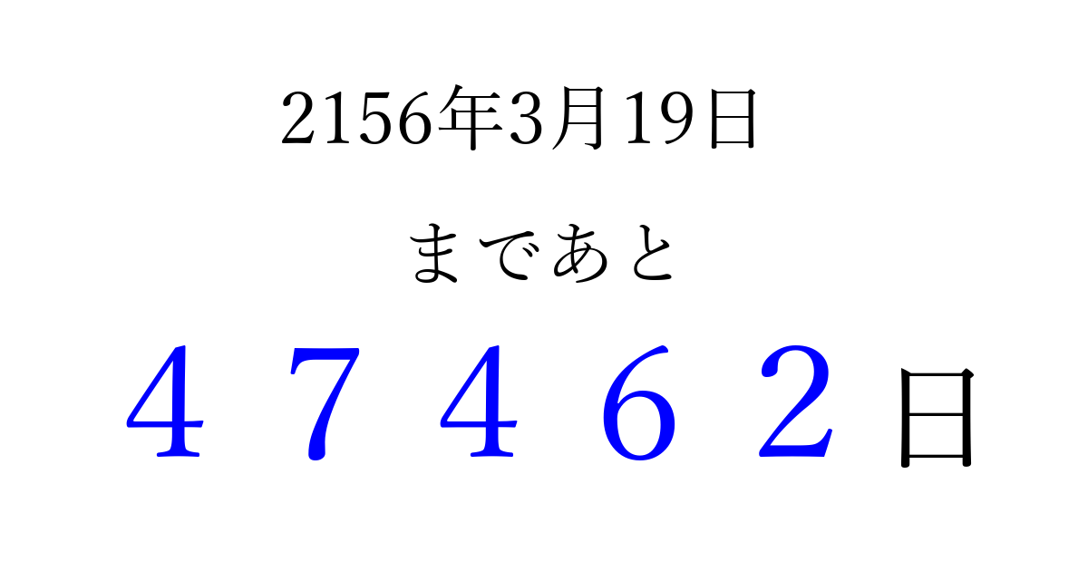 2156年3月19日(金)まで あと 99999 日です 追加すると、トップページからすぐ選べるようになります ※2026/04/08現在の結果です。 最新の状態に更新する ↓シェアして、タイムライン上にカウントダウンを表示しよう!↓ 📤 この結果を共有する Tweet シェア Threads Bluesky 別の日付でカウントダウン 2156年3月のカレンダー このページをブックマークに追加すると、いつでもカウントダウンを確認できます。 (PC: Ctrl+D / Mac: ⌘+D) hitome-notes.comでは以下のページも運営しています。 指定日と期間から日付を計算 | ガチャ確率計算・シミュレーション | プライバシー・ポリシー 運営者:Avocado