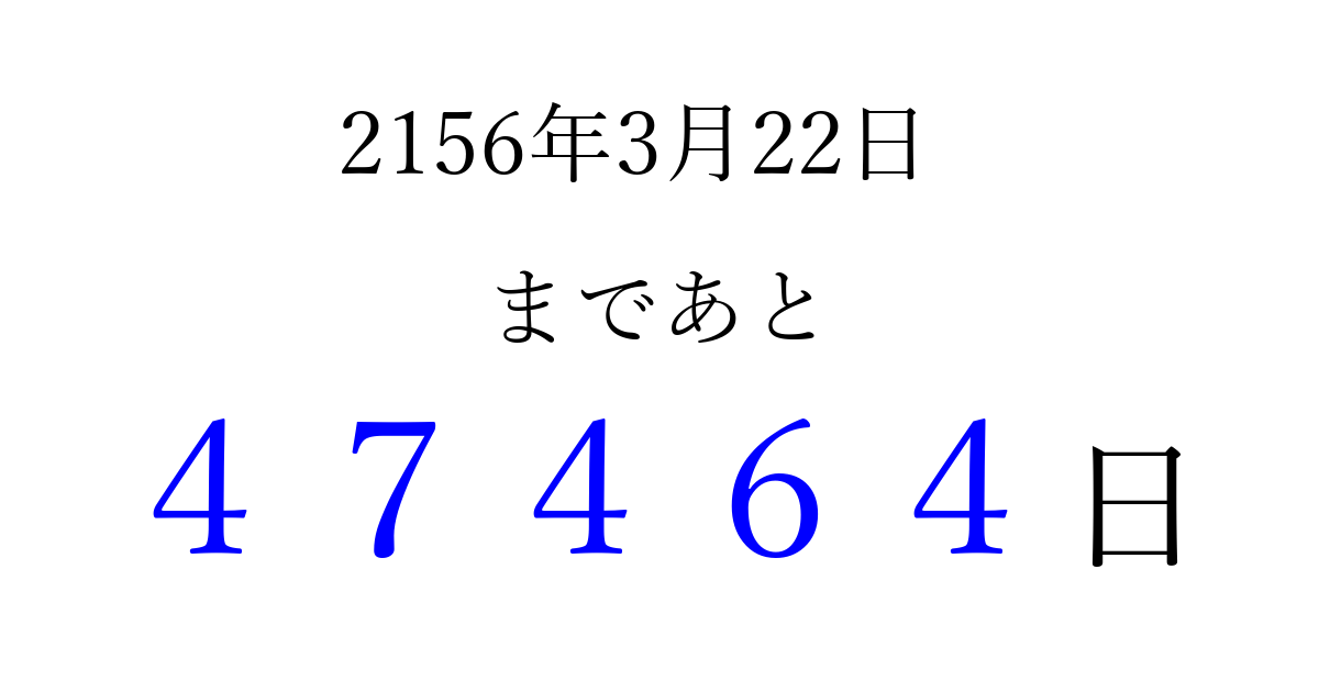 2156年3月22日(月)まで あと 99999 日です 追加すると、トップページからすぐ選べるようになります ※2026/04/09現在の結果です。 最新の状態に更新する ↓シェアして、タイムライン上にカウントダウンを表示しよう!↓ 📤 この結果を共有する Tweet シェア Threads Bluesky 別の日付でカウントダウン 2156年3月のカレンダー このページをブックマークに追加すると、いつでもカウントダウンを確認できます。 (PC: Ctrl+D / Mac: ⌘+D) hitome-notes.comでは以下のページも運営しています。 指定日と期間から日付を計算 | ガチャ確率計算・シミュレーション | プライバシー・ポリシー 運営者:Avocado