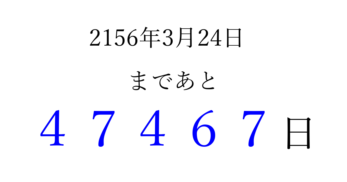 2156年3月24日(水)まで あと 99999 日です 追加すると、トップページからすぐ選べるようになります ※2026/04/08現在の結果です。 最新の状態に更新する ↓シェアして、タイムライン上にカウントダウンを表示しよう!↓ 📤 この結果を共有する Tweet シェア Threads Bluesky 別の日付でカウントダウン 2156年3月のカレンダー このページをブックマークに追加すると、いつでもカウントダウンを確認できます。 (PC: Ctrl+D / Mac: ⌘+D) hitome-notes.comでは以下のページも運営しています。 指定日と期間から日付を計算 | ガチャ確率計算・シミュレーション | プライバシー・ポリシー 運営者:Avocado