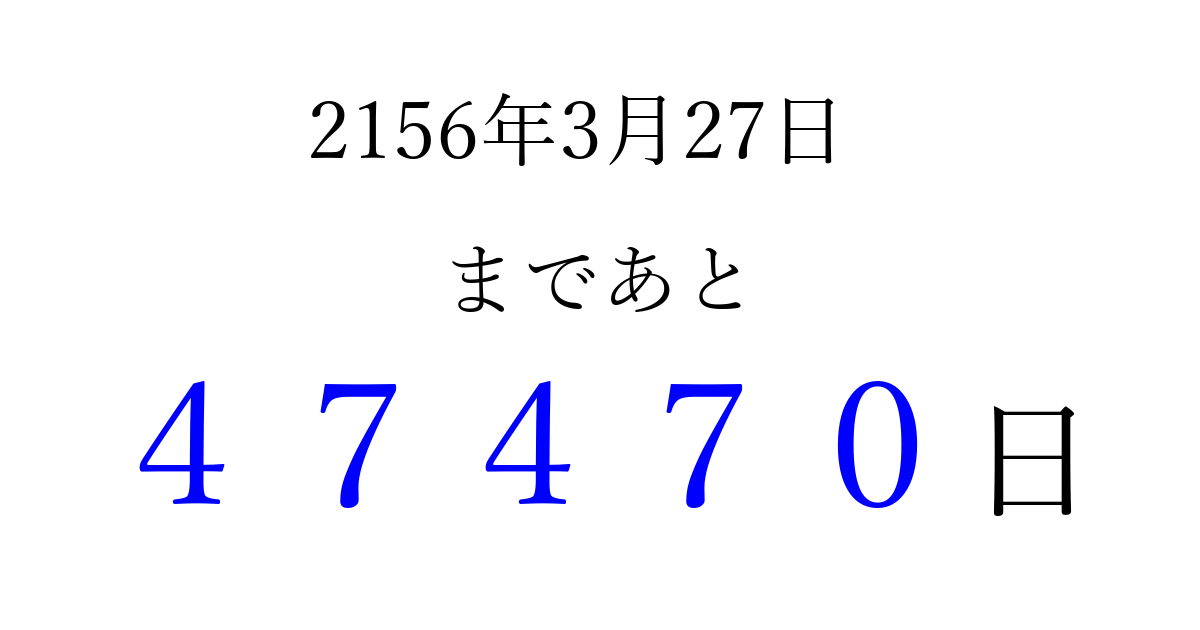 2156年3月27日(土)まで あと 99999 日です 追加すると、トップページからすぐ選べるようになります ※2026/04/08現在の結果です。 最新の状態に更新する ↓シェアして、タイムライン上にカウントダウンを表示しよう!↓ 📤 この結果を共有する Tweet シェア Threads Bluesky 別の日付でカウントダウン 2156年3月のカレンダー このページをブックマークに追加すると、いつでもカウントダウンを確認できます。 (PC: Ctrl+D / Mac: ⌘+D) hitome-notes.comでは以下のページも運営しています。 指定日と期間から日付を計算 | ガチャ確率計算・シミュレーション | プライバシー・ポリシー 運営者:Avocado