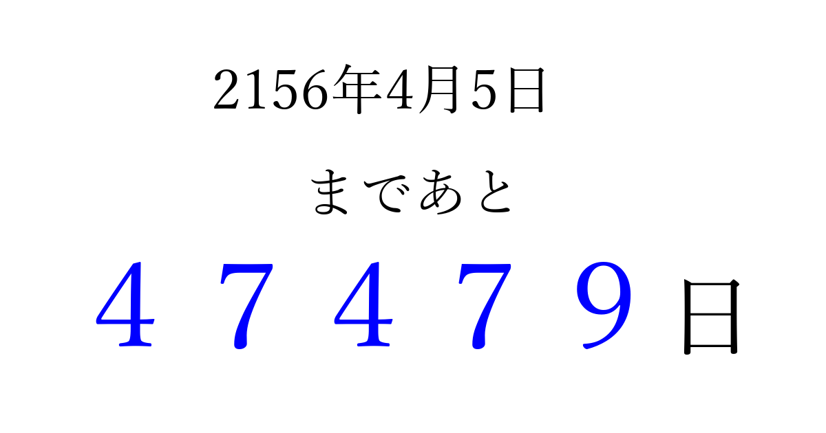 2156年4月5日(月)まで あと 99999 日です 追加すると、トップページからすぐ選べるようになります ※2026/04/08現在の結果です。 最新の状態に更新する ↓シェアして、タイムライン上にカウントダウンを表示しよう!↓ 📤 この結果を共有する Tweet シェア Threads Bluesky 別の日付でカウントダウン 2156年4月のカレンダー このページをブックマークに追加すると、いつでもカウントダウンを確認できます。 (PC: Ctrl+D / Mac: ⌘+D) hitome-notes.comでは以下のページも運営しています。 指定日と期間から日付を計算 | ガチャ確率計算・シミュレーション | プライバシー・ポリシー 運営者:Avocado