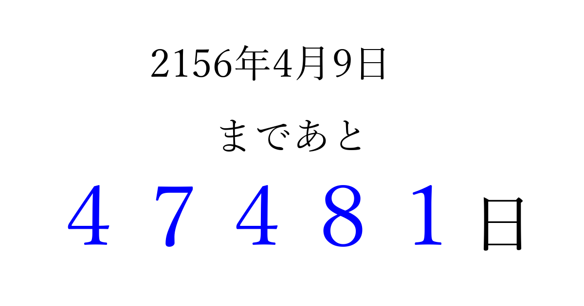 2156年4月9日(金)まで あと 99999 日です 追加すると、トップページからすぐ選べるようになります ※2026/04/10現在の結果です。 最新の状態に更新する ↓シェアして、タイムライン上にカウントダウンを表示しよう!↓ 📤 この結果を共有する Tweet シェア Threads Bluesky 別の日付でカウントダウン 2156年4月のカレンダー このページをブックマークに追加すると、いつでもカウントダウンを確認できます。 (PC: Ctrl+D / Mac: ⌘+D) hitome-notes.comでは以下のページも運営しています。 指定日と期間から日付を計算 | ガチャ確率計算・シミュレーション | プライバシー・ポリシー 運営者:Avocado