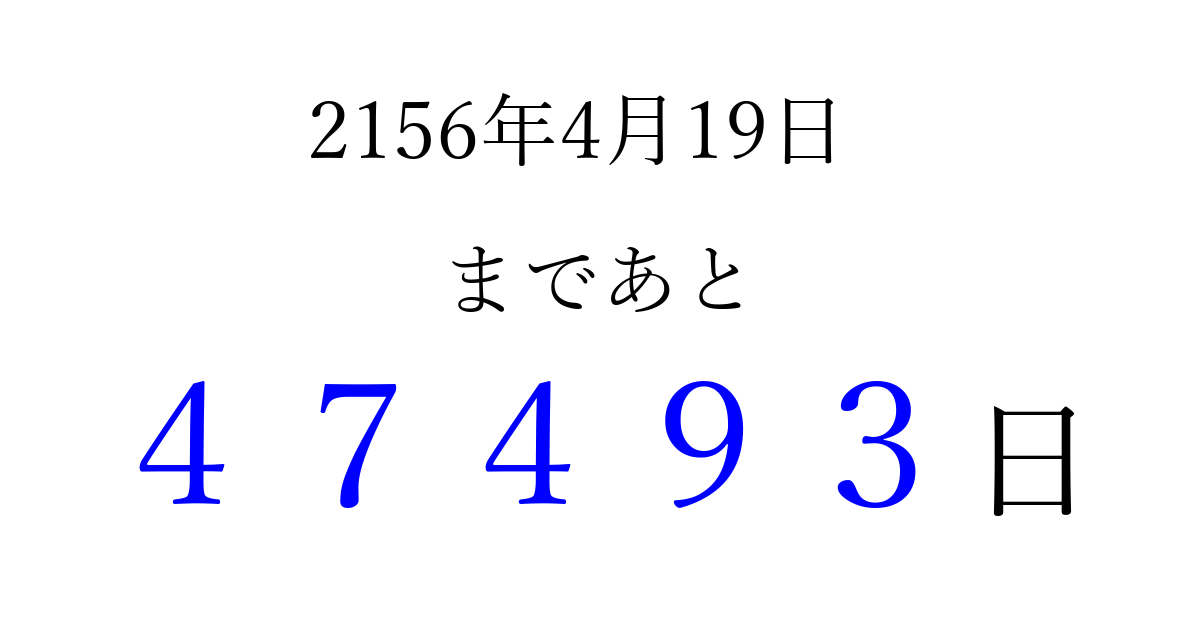 2156年4月19日(月)まで あと 99999 日です 追加すると、トップページからすぐ選べるようになります ※2026/04/08現在の結果です。 最新の状態に更新する ↓シェアして、タイムライン上にカウントダウンを表示しよう!↓ 📤 この結果を共有する Tweet シェア Threads Bluesky 別の日付でカウントダウン 2156年4月のカレンダー このページをブックマークに追加すると、いつでもカウントダウンを確認できます。 (PC: Ctrl+D / Mac: ⌘+D) hitome-notes.comでは以下のページも運営しています。 指定日と期間から日付を計算 | ガチャ確率計算・シミュレーション | プライバシー・ポリシー 運営者:Avocado