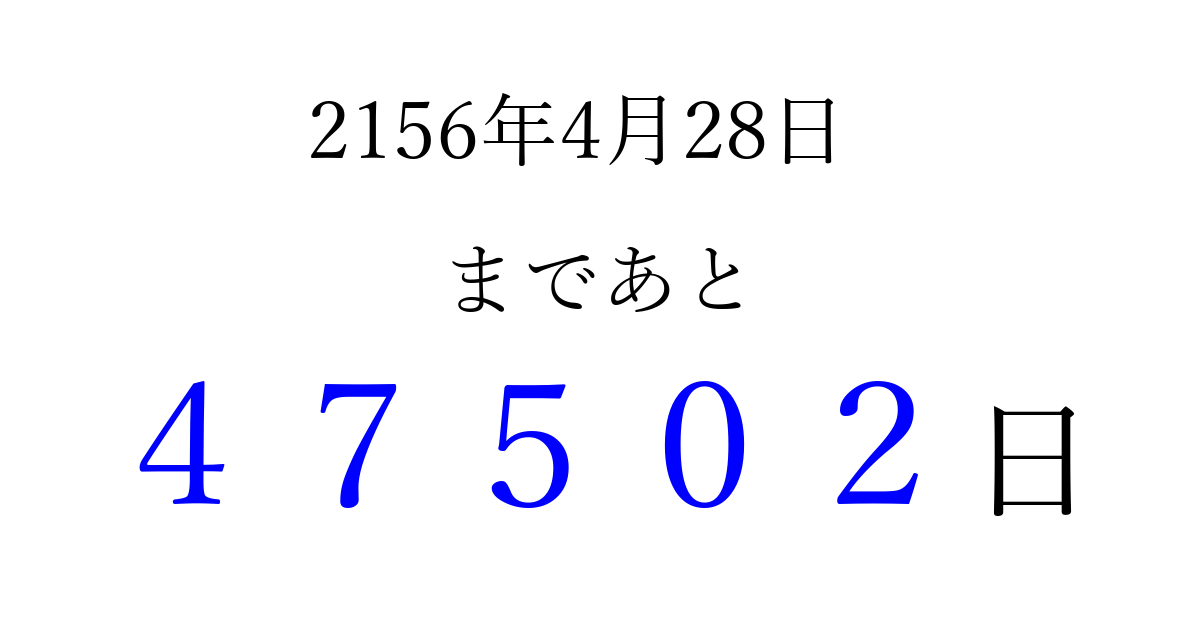 2156年4月28日(水)まで あと 99999 日です 追加すると、トップページからすぐ選べるようになります ※2026/04/08現在の結果です。 最新の状態に更新する ↓シェアして、タイムライン上にカウントダウンを表示しよう!↓ 📤 この結果を共有する Tweet シェア Threads Bluesky 別の日付でカウントダウン 2156年4月のカレンダー このページをブックマークに追加すると、いつでもカウントダウンを確認できます。 (PC: Ctrl+D / Mac: ⌘+D) hitome-notes.comでは以下のページも運営しています。 指定日と期間から日付を計算 | ガチャ確率計算・シミュレーション | プライバシー・ポリシー 運営者:Avocado