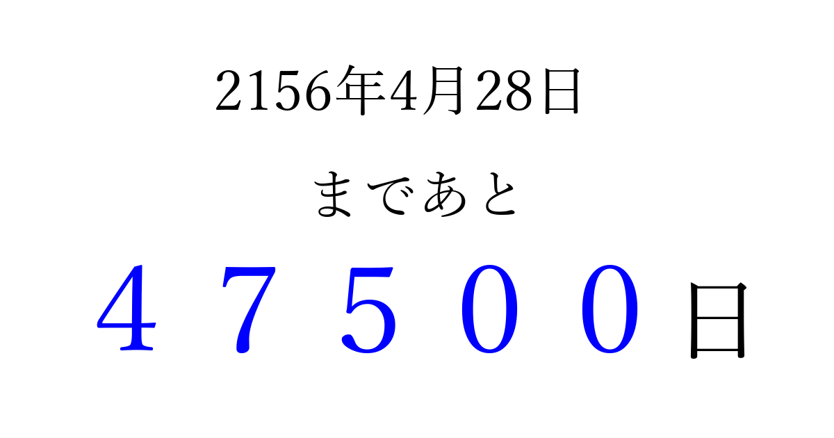 2156年4月28日(水)まで あと 99999 日です 追加すると、トップページからすぐ選べるようになります ※2026/04/10現在の結果です。 最新の状態に更新する ↓シェアして、タイムライン上にカウントダウンを表示しよう!↓ 📤 この結果を共有する Tweet シェア Threads Bluesky 別の日付でカウントダウン 2156年4月のカレンダー このページをブックマークに追加すると、いつでもカウントダウンを確認できます。 (PC: Ctrl+D / Mac: ⌘+D) hitome-notes.comでは以下のページも運営しています。 指定日と期間から日付を計算 | ガチャ確率計算・シミュレーション | プライバシー・ポリシー 運営者:Avocado