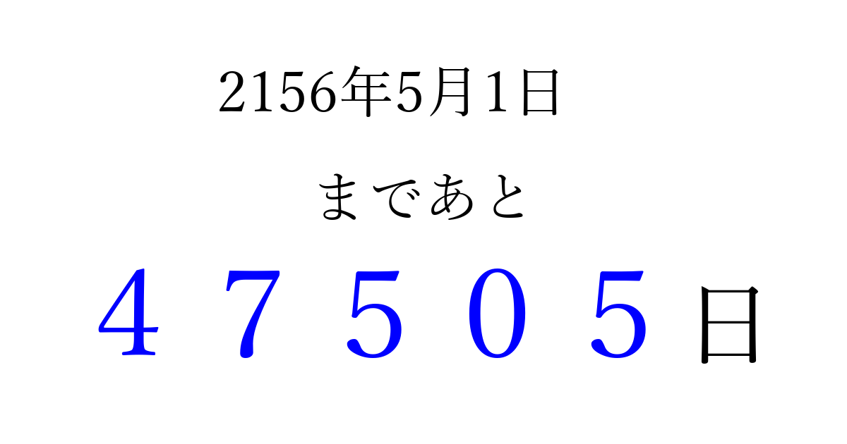 2156年5月1日(土)まで あと 99999 日です 追加すると、トップページからすぐ選べるようになります ※2026/04/08現在の結果です。 最新の状態に更新する ↓シェアして、タイムライン上にカウントダウンを表示しよう!↓ 📤 この結果を共有する Tweet シェア Threads Bluesky 別の日付でカウントダウン 2156年5月のカレンダー このページをブックマークに追加すると、いつでもカウントダウンを確認できます。 (PC: Ctrl+D / Mac: ⌘+D) hitome-notes.comでは以下のページも運営しています。 指定日と期間から日付を計算 | ガチャ確率計算・シミュレーション | プライバシー・ポリシー 運営者:Avocado