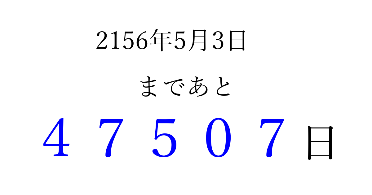 2156年5月3日(月)まで あと 99999 日です 追加すると、トップページからすぐ選べるようになります ※2026/04/08現在の結果です。 最新の状態に更新する ↓シェアして、タイムライン上にカウントダウンを表示しよう!↓ 📤 この結果を共有する Tweet シェア Threads Bluesky 別の日付でカウントダウン 2156年5月のカレンダー このページをブックマークに追加すると、いつでもカウントダウンを確認できます。 (PC: Ctrl+D / Mac: ⌘+D) hitome-notes.comでは以下のページも運営しています。 指定日と期間から日付を計算 | ガチャ確率計算・シミュレーション | プライバシー・ポリシー 運営者:Avocado
