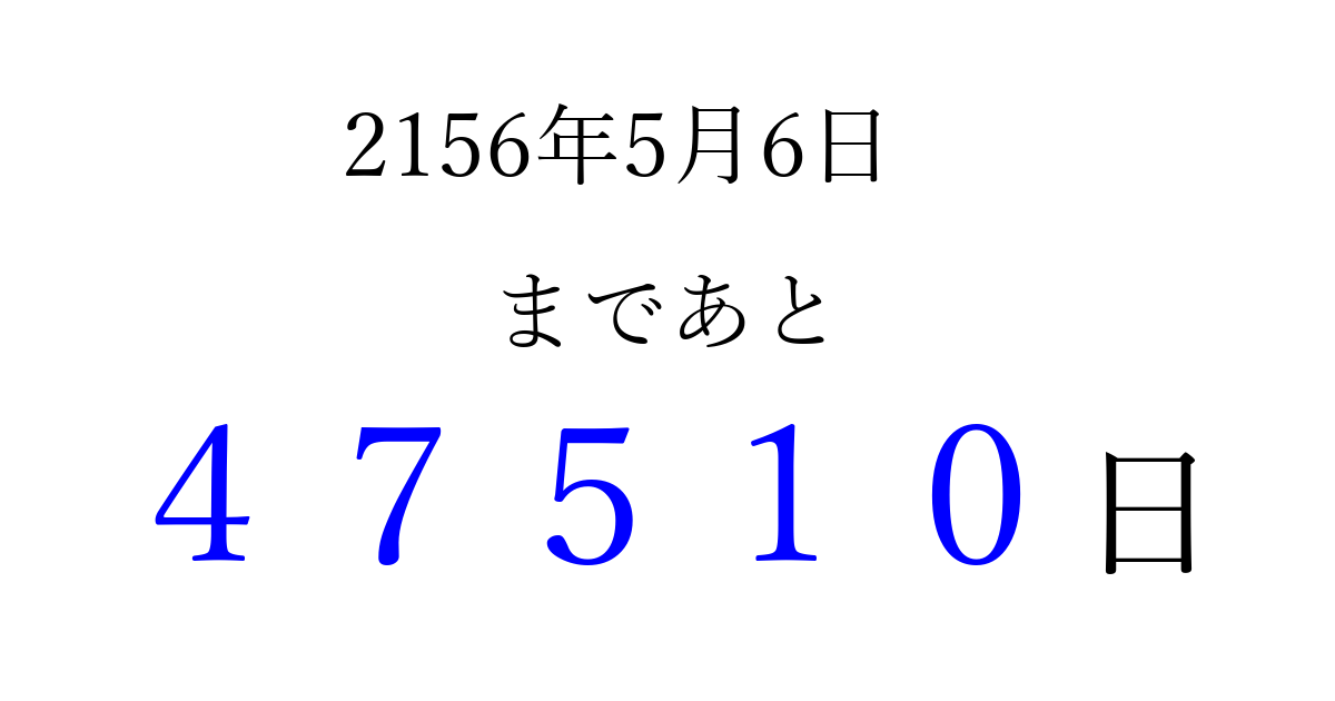 2156年5月6日(木)まで あと 99999 日です 追加すると、トップページからすぐ選べるようになります ※2026/04/08現在の結果です。 最新の状態に更新する ↓シェアして、タイムライン上にカウントダウンを表示しよう!↓ 📤 この結果を共有する Tweet シェア Threads Bluesky 別の日付でカウントダウン 2156年5月のカレンダー このページをブックマークに追加すると、いつでもカウントダウンを確認できます。 (PC: Ctrl+D / Mac: ⌘+D) hitome-notes.comでは以下のページも運営しています。 指定日と期間から日付を計算 | ガチャ確率計算・シミュレーション | プライバシー・ポリシー 運営者:Avocado