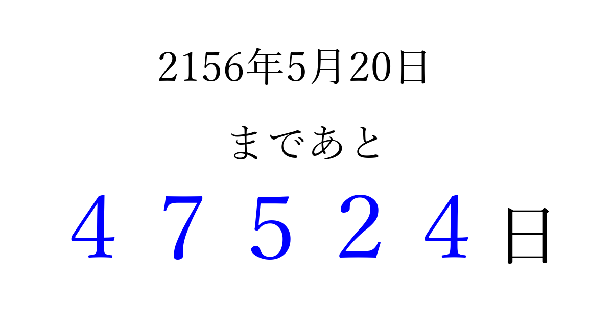 2156年5月20日(木)まで あと 99999 日です 追加すると、トップページからすぐ選べるようになります ※2026/04/08現在の結果です。 最新の状態に更新する ↓シェアして、タイムライン上にカウントダウンを表示しよう!↓ 📤 この結果を共有する Tweet シェア Threads Bluesky 別の日付でカウントダウン 2156年5月のカレンダー このページをブックマークに追加すると、いつでもカウントダウンを確認できます。 (PC: Ctrl+D / Mac: ⌘+D) hitome-notes.comでは以下のページも運営しています。 指定日と期間から日付を計算 | ガチャ確率計算・シミュレーション | プライバシー・ポリシー 運営者:Avocado