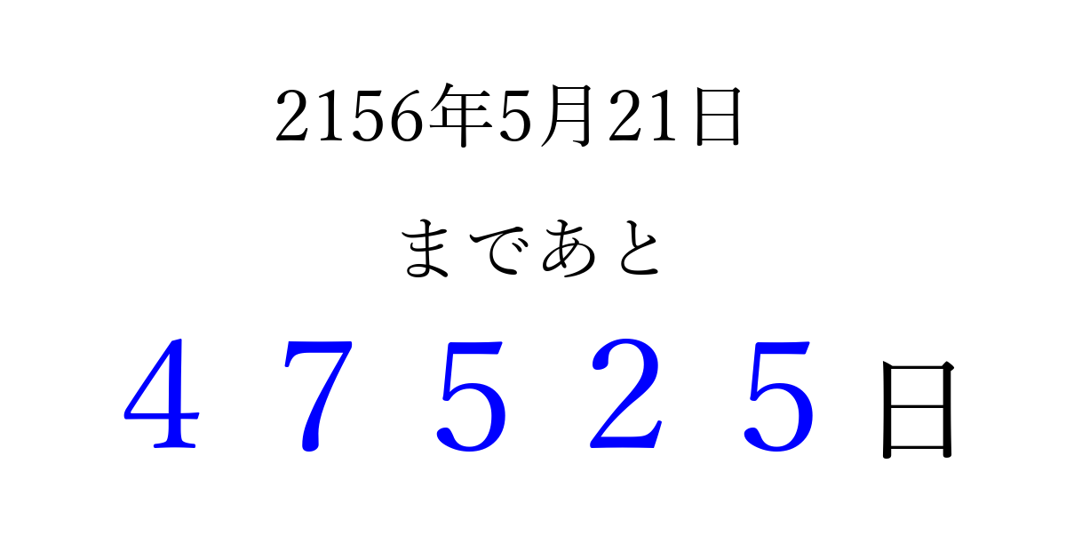 2156年5月21日(金)まで あと 99999 日です 追加すると、トップページからすぐ選べるようになります ※2026/04/08現在の結果です。 最新の状態に更新する ↓シェアして、タイムライン上にカウントダウンを表示しよう!↓ 📤 この結果を共有する Tweet シェア Threads Bluesky 別の日付でカウントダウン 2156年5月のカレンダー このページをブックマークに追加すると、いつでもカウントダウンを確認できます。 (PC: Ctrl+D / Mac: ⌘+D) hitome-notes.comでは以下のページも運営しています。 指定日と期間から日付を計算 | ガチャ確率計算・シミュレーション | プライバシー・ポリシー 運営者:Avocado