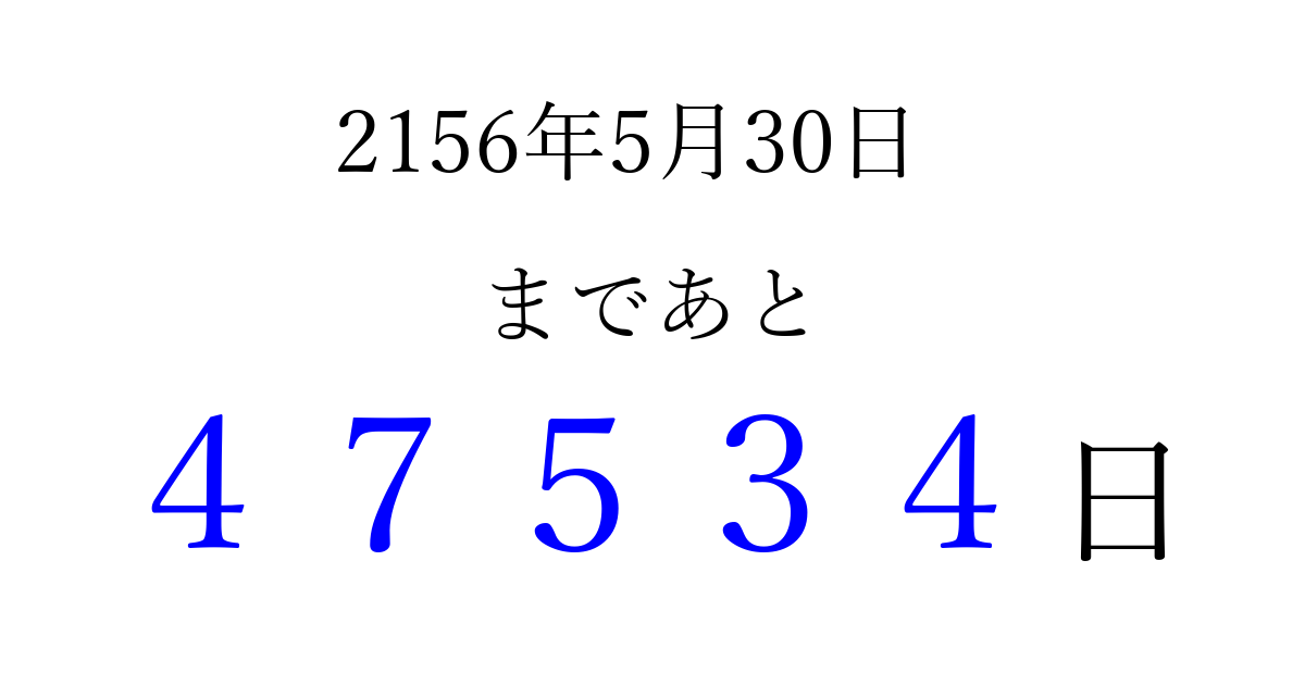 2156年5月30日(日)まで あと 99999 日です 追加すると、トップページからすぐ選べるようになります ※2026/04/08現在の結果です。 最新の状態に更新する ↓シェアして、タイムライン上にカウントダウンを表示しよう!↓ 📤 この結果を共有する Tweet シェア Threads Bluesky 別の日付でカウントダウン 2156年5月のカレンダー このページをブックマークに追加すると、いつでもカウントダウンを確認できます。 (PC: Ctrl+D / Mac: ⌘+D) hitome-notes.comでは以下のページも運営しています。 指定日と期間から日付を計算 | ガチャ確率計算・シミュレーション | プライバシー・ポリシー 運営者:Avocado