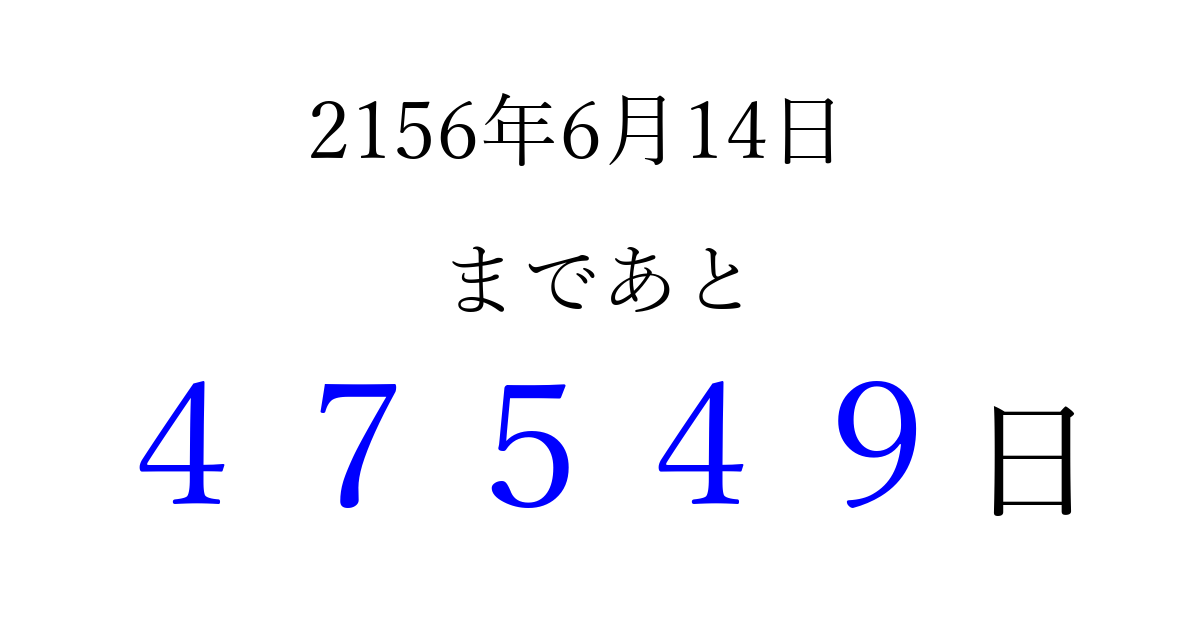 2156年6月14日(月)まで あと 99999 日です 追加すると、トップページからすぐ選べるようになります ※2026/04/08現在の結果です。 最新の状態に更新する ↓シェアして、タイムライン上にカウントダウンを表示しよう!↓ 📤 この結果を共有する Tweet シェア Threads Bluesky 別の日付でカウントダウン 2156年6月のカレンダー このページをブックマークに追加すると、いつでもカウントダウンを確認できます。 (PC: Ctrl+D / Mac: ⌘+D) hitome-notes.comでは以下のページも運営しています。 指定日と期間から日付を計算 | ガチャ確率計算・シミュレーション | プライバシー・ポリシー 運営者:Avocado