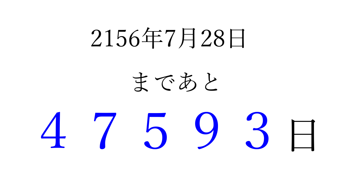2156年7月28日(水)まで あと 99999 日です 追加すると、トップページからすぐ選べるようになります ※2026/04/08現在の結果です。 最新の状態に更新する ↓シェアして、タイムライン上にカウントダウンを表示しよう!↓ 📤 この結果を共有する Tweet シェア Threads Bluesky 別の日付でカウントダウン 2156年7月のカレンダー このページをブックマークに追加すると、いつでもカウントダウンを確認できます。 (PC: Ctrl+D / Mac: ⌘+D) hitome-notes.comでは以下のページも運営しています。 指定日と期間から日付を計算 | ガチャ確率計算・シミュレーション | プライバシー・ポリシー 運営者:Avocado