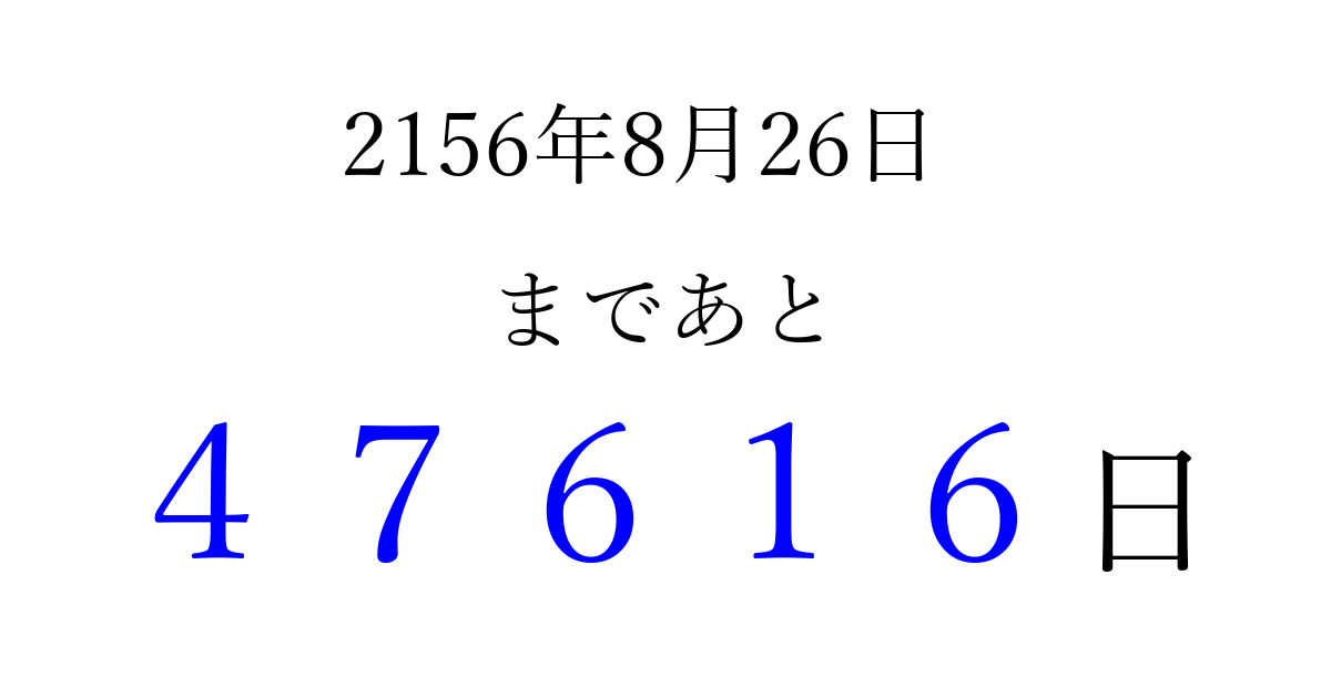 2156年8月26日(木)まで あと 99999 日です 追加すると、トップページからすぐ選べるようになります ※2026/04/14現在の結果です。 最新の状態に更新する ↓シェアして、タイムライン上にカウントダウンを表示しよう!↓ 📤 この結果を共有する Tweet シェア Threads Bluesky 別の日付でカウントダウン 2156年8月のカレンダー このページをブックマークに追加すると、いつでもカウントダウンを確認できます。 (PC: Ctrl+D / Mac: ⌘+D) hitome-notes.comでは以下のページも運営しています。 指定日と期間から日付を計算 | ガチャ確率計算・シミュレーション | プライバシー・ポリシー 運営者:Avocado