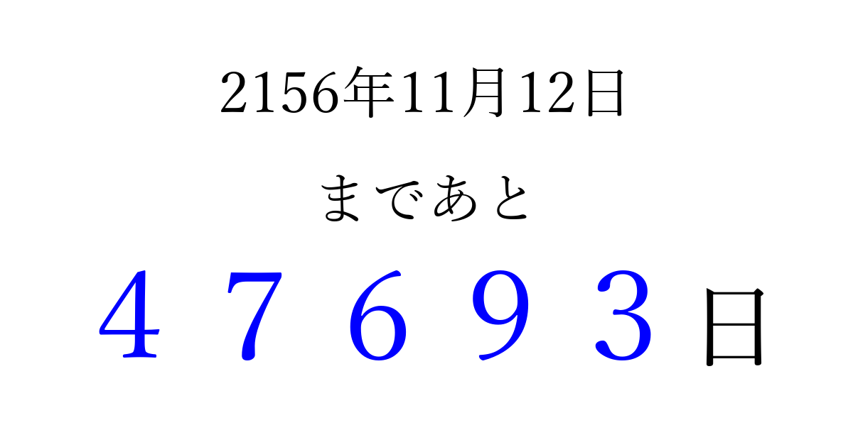 2156年11月12日(金)まで あと 99999 日です 追加すると、トップページからすぐ選べるようになります ※2026/04/15現在の結果です。 最新の状態に更新する ↓シェアして、タイムライン上にカウントダウンを表示しよう!↓ 📤 この結果を共有する Tweet シェア Threads Bluesky 別の日付でカウントダウン 2156年11月のカレンダー このページをブックマークに追加すると、いつでもカウントダウンを確認できます。 (PC: Ctrl+D / Mac: ⌘+D) hitome-notes.comでは以下のページも運営しています。 指定日と期間から日付を計算 | ガチャ確率計算・シミュレーション | プライバシー・ポリシー 運営者:Avocado