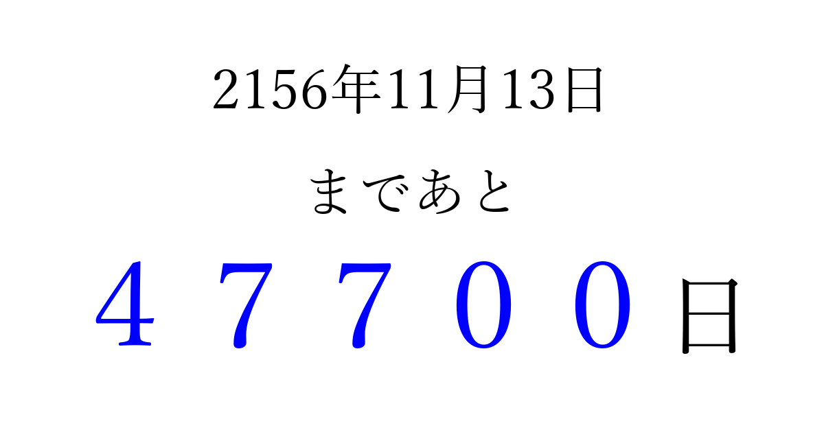 2156年11月13日(土)まで あと 99999 日です 追加すると、トップページからすぐ選べるようになります ※2026/04/09現在の結果です。 最新の状態に更新する ↓シェアして、タイムライン上にカウントダウンを表示しよう!↓ 📤 この結果を共有する Tweet シェア Threads Bluesky 別の日付でカウントダウン 2156年11月のカレンダー このページをブックマークに追加すると、いつでもカウントダウンを確認できます。 (PC: Ctrl+D / Mac: ⌘+D) hitome-notes.comでは以下のページも運営しています。 指定日と期間から日付を計算 | ガチャ確率計算・シミュレーション | プライバシー・ポリシー 運営者:Avocado