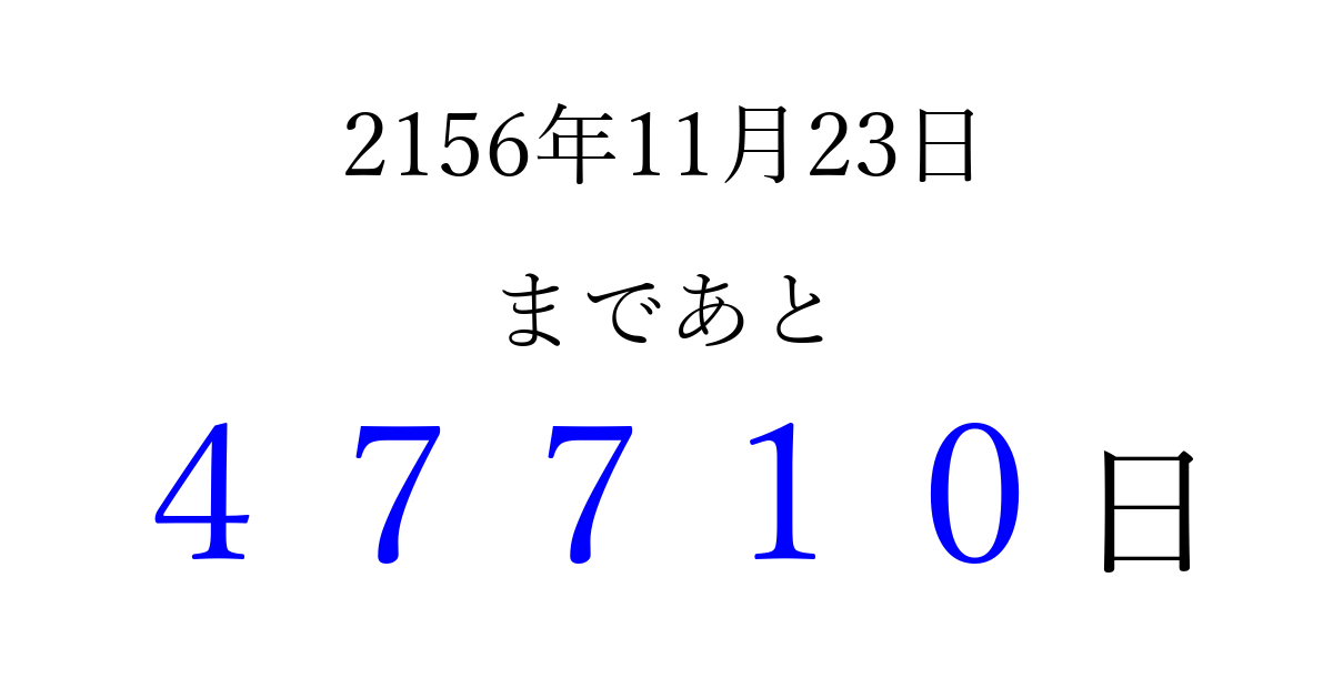 2156年11月23日(火)まで あと 99999 日です 追加すると、トップページからすぐ選べるようになります ※2026/04/09現在の結果です。 最新の状態に更新する ↓シェアして、タイムライン上にカウントダウンを表示しよう!↓ 📤 この結果を共有する Tweet シェア Threads Bluesky 別の日付でカウントダウン 2156年11月のカレンダー このページをブックマークに追加すると、いつでもカウントダウンを確認できます。 (PC: Ctrl+D / Mac: ⌘+D) hitome-notes.comでは以下のページも運営しています。 指定日と期間から日付を計算 | ガチャ確率計算・シミュレーション | プライバシー・ポリシー 運営者:Avocado