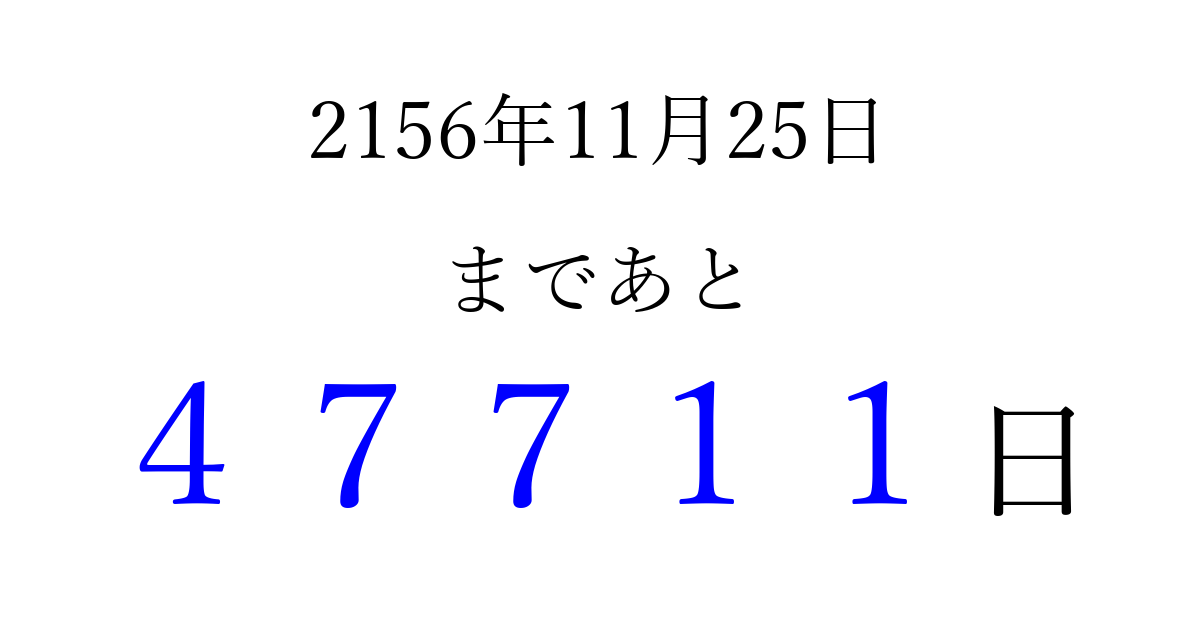 2156年11月25日(木)まで あと 99999 日です 追加すると、トップページからすぐ選べるようになります ※2026/04/10現在の結果です。 最新の状態に更新する ↓シェアして、タイムライン上にカウントダウンを表示しよう!↓ 📤 この結果を共有する Tweet シェア Threads Bluesky 別の日付でカウントダウン 2156年11月のカレンダー このページをブックマークに追加すると、いつでもカウントダウンを確認できます。 (PC: Ctrl+D / Mac: ⌘+D) hitome-notes.comでは以下のページも運営しています。 指定日と期間から日付を計算 | ガチャ確率計算・シミュレーション | プライバシー・ポリシー 運営者:Avocado
