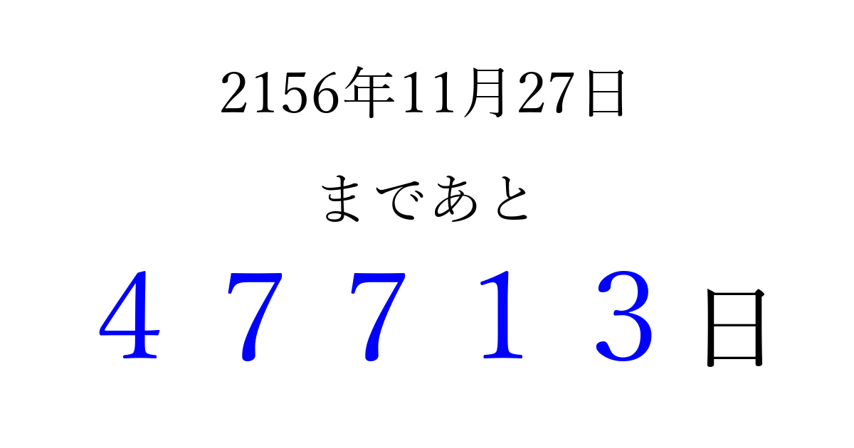 2156年11月27日(土)まで あと 99999 日です 追加すると、トップページからすぐ選べるようになります ※2026/04/10現在の結果です。 最新の状態に更新する ↓シェアして、タイムライン上にカウントダウンを表示しよう!↓ 📤 この結果を共有する Tweet シェア Threads Bluesky 別の日付でカウントダウン 2156年11月のカレンダー このページをブックマークに追加すると、いつでもカウントダウンを確認できます。 (PC: Ctrl+D / Mac: ⌘+D) hitome-notes.comでは以下のページも運営しています。 指定日と期間から日付を計算 | ガチャ確率計算・シミュレーション | プライバシー・ポリシー 運営者:Avocado