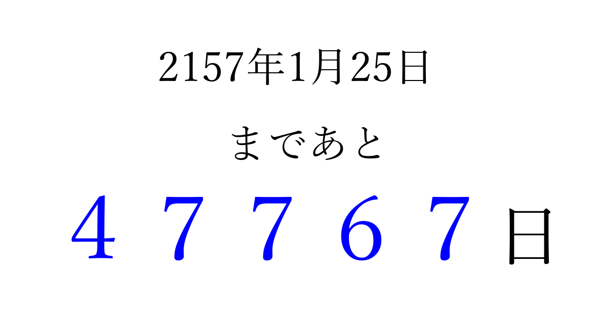 2157年1月25日(火)まで あと 99999 日です 追加すると、トップページからすぐ選べるようになります ※2026/04/15現在の結果です。 最新の状態に更新する ↓シェアして、タイムライン上にカウントダウンを表示しよう!↓ 📤 この結果を共有する Tweet シェア Threads Bluesky 別の日付でカウントダウン 2157年1月のカレンダー このページをブックマークに追加すると、いつでもカウントダウンを確認できます。 (PC: Ctrl+D / Mac: ⌘+D) hitome-notes.comでは以下のページも運営しています。 指定日と期間から日付を計算 | ガチャ確率計算・シミュレーション | プライバシー・ポリシー 運営者:Avocado