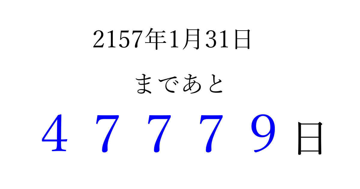 2157年1月31日(月)まで あと 99999 日です 追加すると、トップページからすぐ選べるようになります ※2026/04/09現在の結果です。 最新の状態に更新する ↓シェアして、タイムライン上にカウントダウンを表示しよう!↓ 📤 この結果を共有する Tweet シェア Threads Bluesky 別の日付でカウントダウン 2157年1月のカレンダー このページをブックマークに追加すると、いつでもカウントダウンを確認できます。 (PC: Ctrl+D / Mac: ⌘+D) hitome-notes.comでは以下のページも運営しています。 指定日と期間から日付を計算 | ガチャ確率計算・シミュレーション | プライバシー・ポリシー 運営者:Avocado