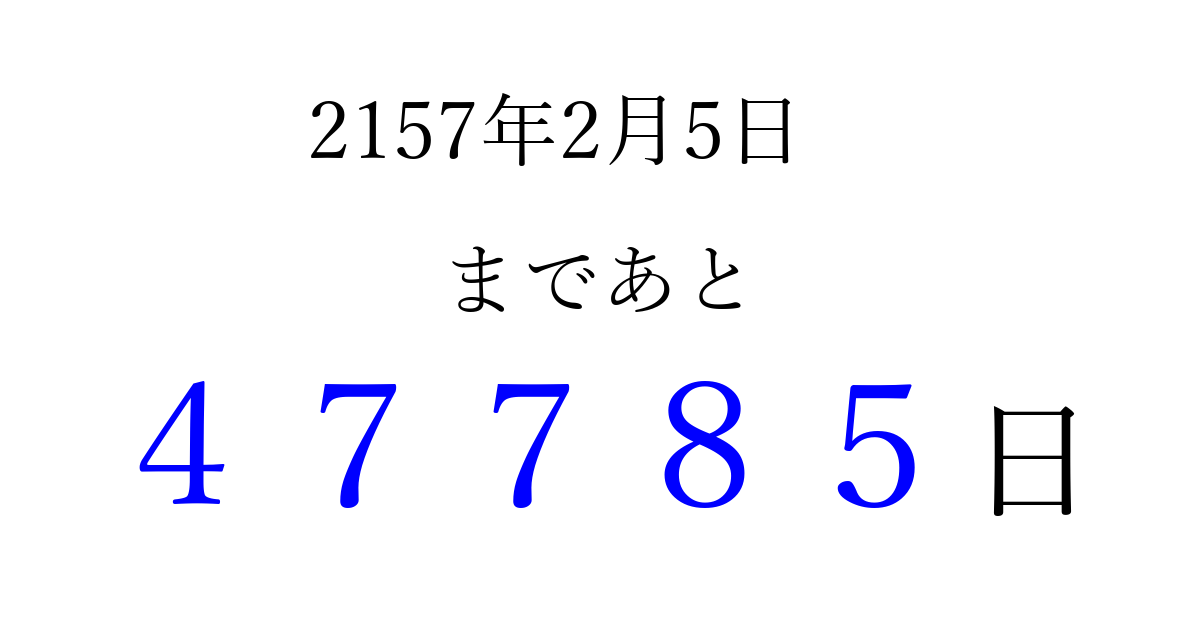 2157年2月5日(土)まで あと 99999 日です 追加すると、トップページからすぐ選べるようになります ※2026/04/08現在の結果です。 最新の状態に更新する ↓シェアして、タイムライン上にカウントダウンを表示しよう!↓ 📤 この結果を共有する Tweet シェア Threads Bluesky 別の日付でカウントダウン 2157年2月のカレンダー このページをブックマークに追加すると、いつでもカウントダウンを確認できます。 (PC: Ctrl+D / Mac: ⌘+D) hitome-notes.comでは以下のページも運営しています。 指定日と期間から日付を計算 | ガチャ確率計算・シミュレーション | プライバシー・ポリシー 運営者:Avocado
