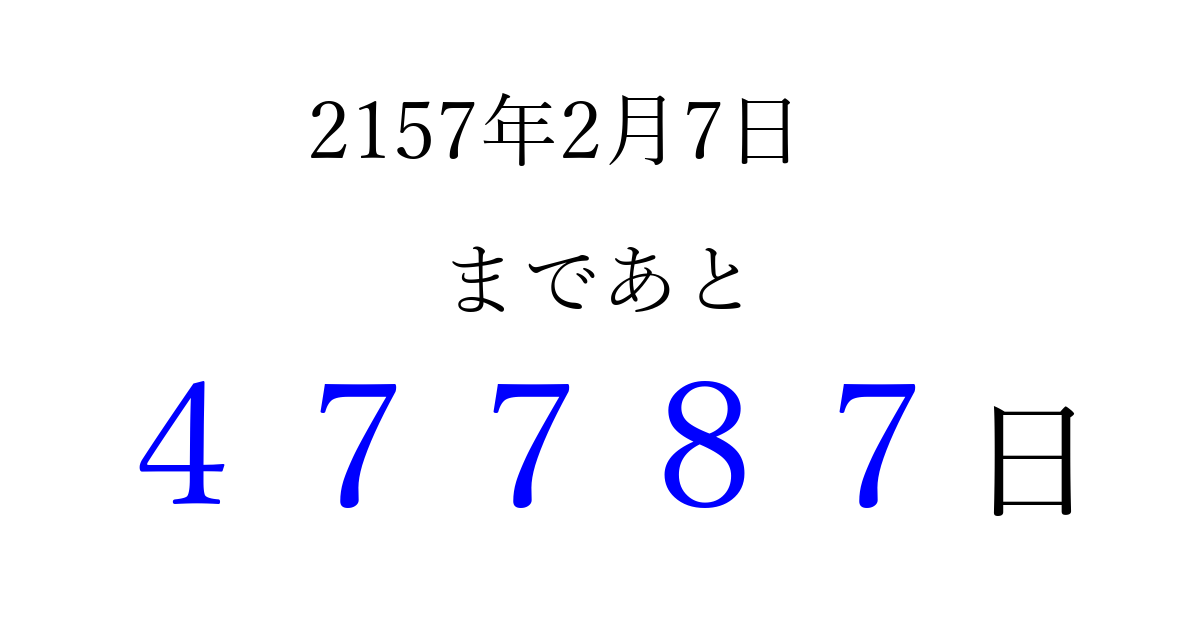 2157年2月7日(月)まで あと 99999 日です 追加すると、トップページからすぐ選べるようになります ※2026/04/08現在の結果です。 最新の状態に更新する ↓シェアして、タイムライン上にカウントダウンを表示しよう!↓ 📤 この結果を共有する Tweet シェア Threads Bluesky 別の日付でカウントダウン 2157年2月のカレンダー このページをブックマークに追加すると、いつでもカウントダウンを確認できます。 (PC: Ctrl+D / Mac: ⌘+D) hitome-notes.comでは以下のページも運営しています。 指定日と期間から日付を計算 | ガチャ確率計算・シミュレーション | プライバシー・ポリシー 運営者:Avocado