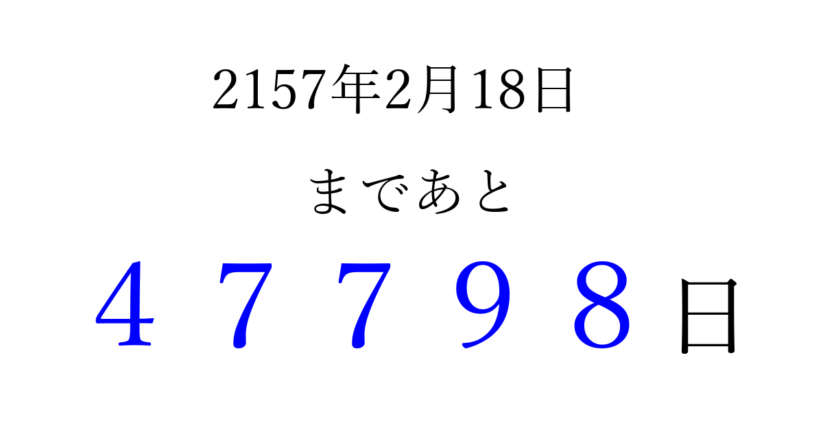 2157年2月18日(金)まで あと 99999 日です 追加すると、トップページからすぐ選べるようになります ※2026/04/08現在の結果です。 最新の状態に更新する ↓シェアして、タイムライン上にカウントダウンを表示しよう!↓ 📤 この結果を共有する Tweet シェア Threads Bluesky 別の日付でカウントダウン 2157年2月のカレンダー このページをブックマークに追加すると、いつでもカウントダウンを確認できます。 (PC: Ctrl+D / Mac: ⌘+D) hitome-notes.comでは以下のページも運営しています。 指定日と期間から日付を計算 | ガチャ確率計算・シミュレーション | プライバシー・ポリシー 運営者:Avocado