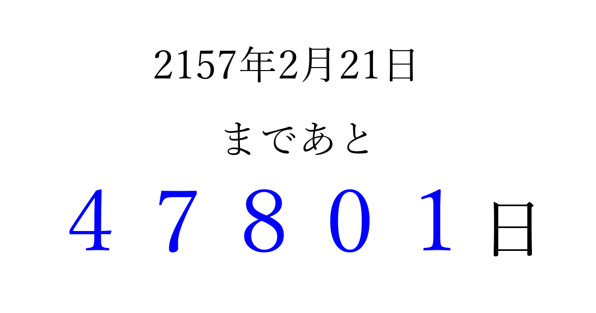 2157年2月21日(月)まで あと 99999 日です 追加すると、トップページからすぐ選べるようになります ※2026/04/08現在の結果です。 最新の状態に更新する ↓シェアして、タイムライン上にカウントダウンを表示しよう!↓ 📤 この結果を共有する Tweet シェア Threads Bluesky 別の日付でカウントダウン 2157年2月のカレンダー このページをブックマークに追加すると、いつでもカウントダウンを確認できます。 (PC: Ctrl+D / Mac: ⌘+D) hitome-notes.comでは以下のページも運営しています。 指定日と期間から日付を計算 | ガチャ確率計算・シミュレーション | プライバシー・ポリシー 運営者:Avocado