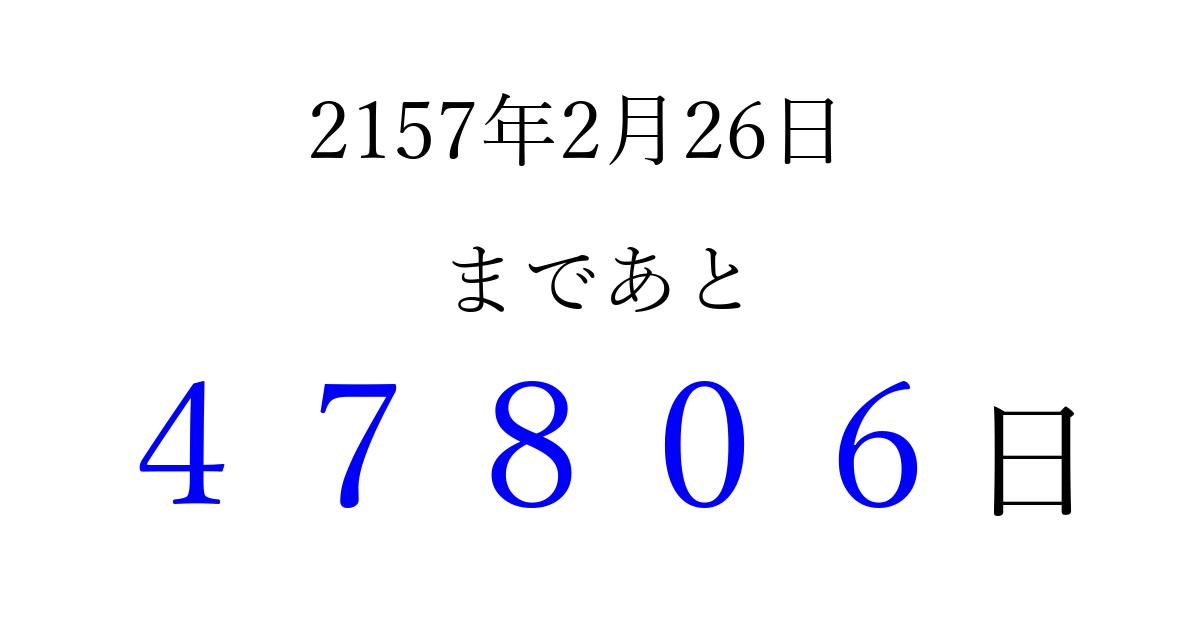 2157年2月26日(土)まで あと 99999 日です 追加すると、トップページからすぐ選べるようになります ※2026/04/08現在の結果です。 最新の状態に更新する ↓シェアして、タイムライン上にカウントダウンを表示しよう!↓ 📤 この結果を共有する Tweet シェア Threads Bluesky 別の日付でカウントダウン 2157年2月のカレンダー このページをブックマークに追加すると、いつでもカウントダウンを確認できます。 (PC: Ctrl+D / Mac: ⌘+D) hitome-notes.comでは以下のページも運営しています。 指定日と期間から日付を計算 | ガチャ確率計算・シミュレーション | プライバシー・ポリシー 運営者:Avocado