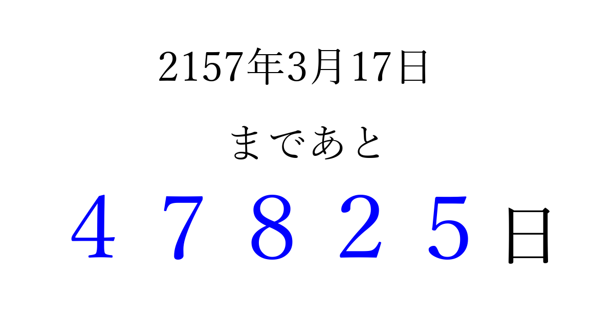 2157年3月17日(木)まで あと 99999 日です 追加すると、トップページからすぐ選べるようになります ※2026/04/08現在の結果です。 最新の状態に更新する ↓シェアして、タイムライン上にカウントダウンを表示しよう!↓ 📤 この結果を共有する Tweet シェア Threads Bluesky 別の日付でカウントダウン 2157年3月のカレンダー このページをブックマークに追加すると、いつでもカウントダウンを確認できます。 (PC: Ctrl+D / Mac: ⌘+D) hitome-notes.comでは以下のページも運営しています。 指定日と期間から日付を計算 | ガチャ確率計算・シミュレーション | プライバシー・ポリシー 運営者:Avocado
