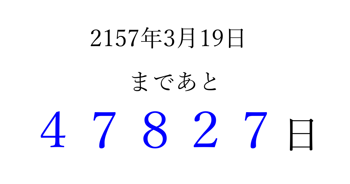 2157年3月19日(土)まで あと 99999 日です 追加すると、トップページからすぐ選べるようになります ※2026/04/08現在の結果です。 最新の状態に更新する ↓シェアして、タイムライン上にカウントダウンを表示しよう!↓ 📤 この結果を共有する Tweet シェア Threads Bluesky 別の日付でカウントダウン 2157年3月のカレンダー このページをブックマークに追加すると、いつでもカウントダウンを確認できます。 (PC: Ctrl+D / Mac: ⌘+D) hitome-notes.comでは以下のページも運営しています。 指定日と期間から日付を計算 | ガチャ確率計算・シミュレーション | プライバシー・ポリシー 運営者:Avocado