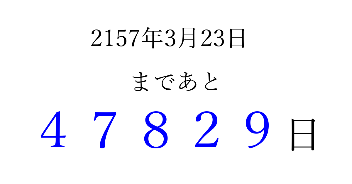 2157年3月23日(水)まで あと 99999 日です 追加すると、トップページからすぐ選べるようになります ※2026/04/10現在の結果です。 最新の状態に更新する ↓シェアして、タイムライン上にカウントダウンを表示しよう!↓ 📤 この結果を共有する Tweet シェア Threads Bluesky 別の日付でカウントダウン 2157年3月のカレンダー このページをブックマークに追加すると、いつでもカウントダウンを確認できます。 (PC: Ctrl+D / Mac: ⌘+D) hitome-notes.comでは以下のページも運営しています。 指定日と期間から日付を計算 | ガチャ確率計算・シミュレーション | プライバシー・ポリシー 運営者:Avocado