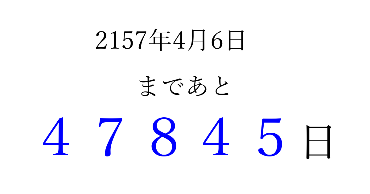 2157年4月6日(水)まで あと 99999 日です 追加すると、トップページからすぐ選べるようになります ※2026/04/08現在の結果です。 最新の状態に更新する ↓シェアして、タイムライン上にカウントダウンを表示しよう!↓ 📤 この結果を共有する Tweet シェア Threads Bluesky 別の日付でカウントダウン 2157年4月のカレンダー このページをブックマークに追加すると、いつでもカウントダウンを確認できます。 (PC: Ctrl+D / Mac: ⌘+D) hitome-notes.comでは以下のページも運営しています。 指定日と期間から日付を計算 | ガチャ確率計算・シミュレーション | プライバシー・ポリシー 運営者:Avocado