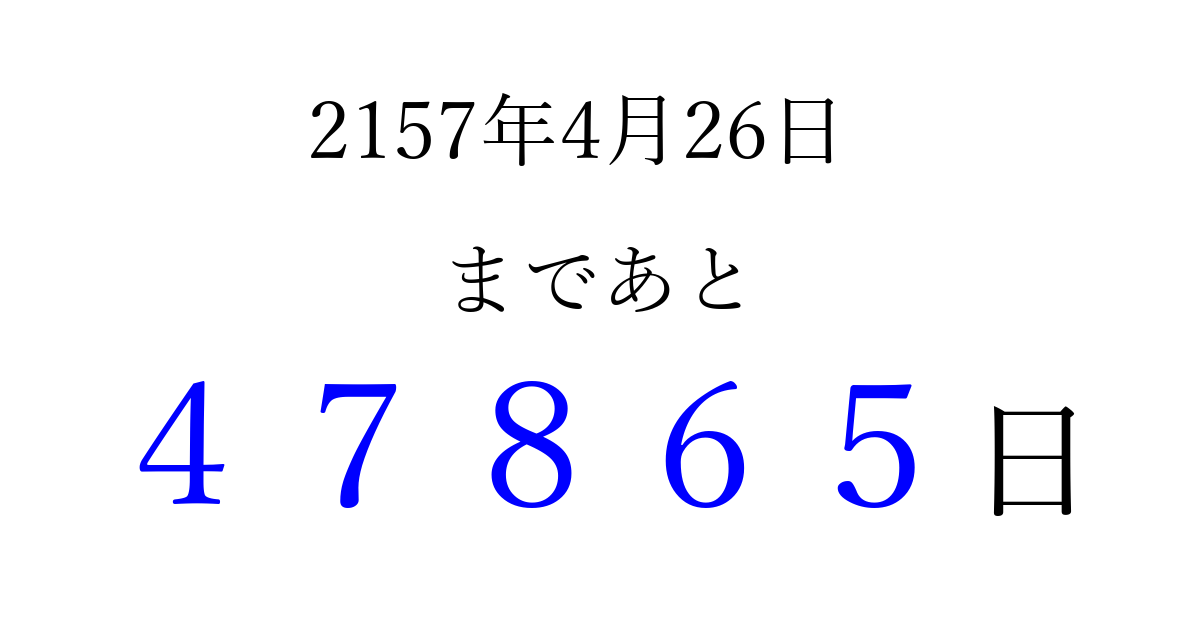 2157年4月26日(火)まで あと 99999 日です 追加すると、トップページからすぐ選べるようになります ※2026/04/08現在の結果です。 最新の状態に更新する ↓シェアして、タイムライン上にカウントダウンを表示しよう!↓ 📤 この結果を共有する Tweet シェア Threads Bluesky 別の日付でカウントダウン 2157年4月のカレンダー このページをブックマークに追加すると、いつでもカウントダウンを確認できます。 (PC: Ctrl+D / Mac: ⌘+D) hitome-notes.comでは以下のページも運営しています。 指定日と期間から日付を計算 | ガチャ確率計算・シミュレーション | プライバシー・ポリシー 運営者:Avocado