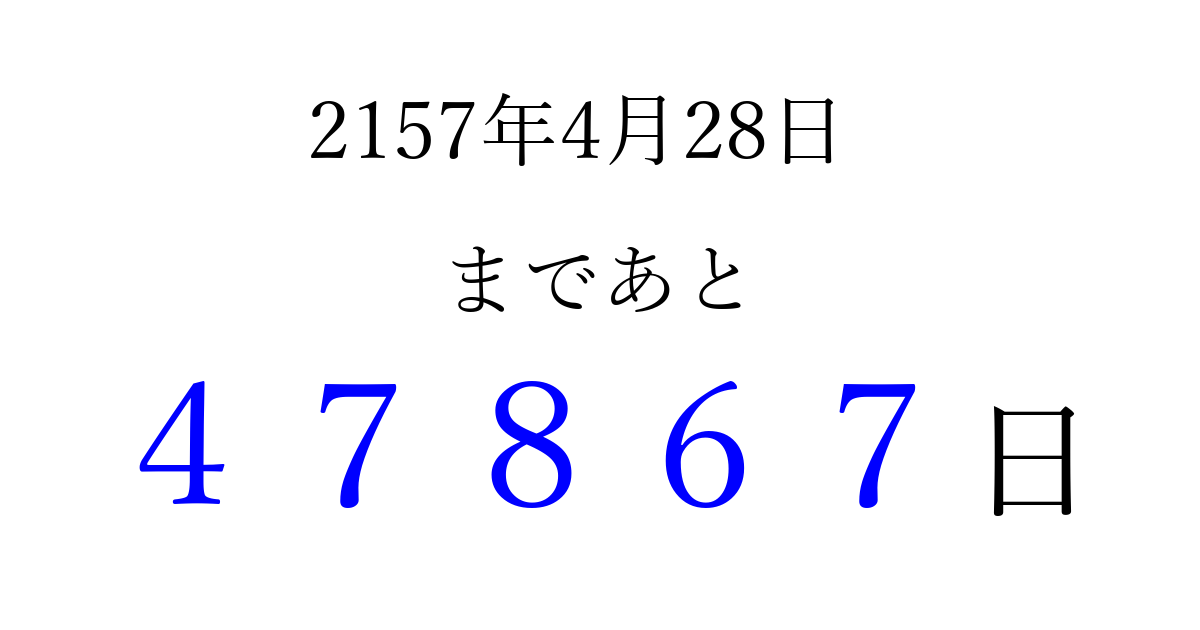 2157年4月28日(木)まで あと 99999 日です 追加すると、トップページからすぐ選べるようになります ※2026/04/08現在の結果です。 最新の状態に更新する ↓シェアして、タイムライン上にカウントダウンを表示しよう!↓ 📤 この結果を共有する Tweet シェア Threads Bluesky 別の日付でカウントダウン 2157年4月のカレンダー このページをブックマークに追加すると、いつでもカウントダウンを確認できます。 (PC: Ctrl+D / Mac: ⌘+D) hitome-notes.comでは以下のページも運営しています。 指定日と期間から日付を計算 | ガチャ確率計算・シミュレーション | プライバシー・ポリシー 運営者:Avocado