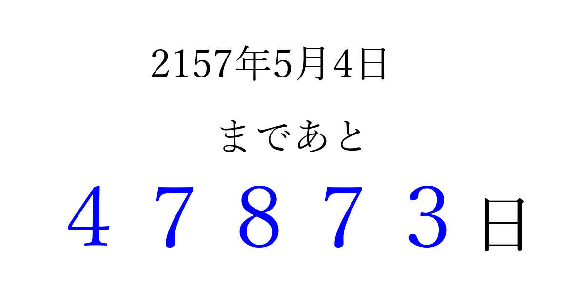 2157年5月4日(水)まで あと 99999 日です 追加すると、トップページからすぐ選べるようになります ※2026/04/08現在の結果です。 最新の状態に更新する ↓シェアして、タイムライン上にカウントダウンを表示しよう!↓ 📤 この結果を共有する Tweet シェア Threads Bluesky 別の日付でカウントダウン 2157年5月のカレンダー このページをブックマークに追加すると、いつでもカウントダウンを確認できます。 (PC: Ctrl+D / Mac: ⌘+D) hitome-notes.comでは以下のページも運営しています。 指定日と期間から日付を計算 | ガチャ確率計算・シミュレーション | プライバシー・ポリシー 運営者:Avocado