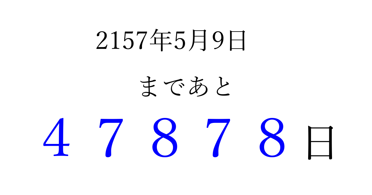 2157年5月9日(月)まで あと 99999 日です 追加すると、トップページからすぐ選べるようになります ※2026/04/08現在の結果です。 最新の状態に更新する ↓シェアして、タイムライン上にカウントダウンを表示しよう!↓ 📤 この結果を共有する Tweet シェア Threads Bluesky 別の日付でカウントダウン 2157年5月のカレンダー このページをブックマークに追加すると、いつでもカウントダウンを確認できます。 (PC: Ctrl+D / Mac: ⌘+D) hitome-notes.comでは以下のページも運営しています。 指定日と期間から日付を計算 | ガチャ確率計算・シミュレーション | プライバシー・ポリシー 運営者:Avocado