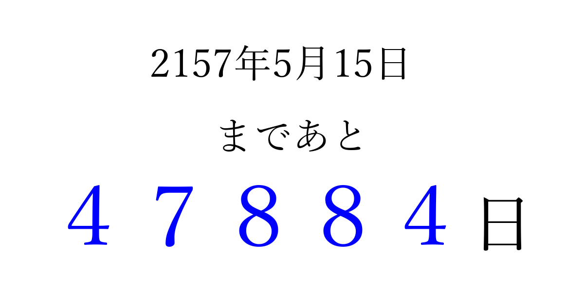 2157年5月15日(日)まで あと 99999 日です 追加すると、トップページからすぐ選べるようになります ※2026/04/08現在の結果です。 最新の状態に更新する ↓シェアして、タイムライン上にカウントダウンを表示しよう!↓ 📤 この結果を共有する Tweet シェア Threads Bluesky 別の日付でカウントダウン 2157年5月のカレンダー このページをブックマークに追加すると、いつでもカウントダウンを確認できます。 (PC: Ctrl+D / Mac: ⌘+D) hitome-notes.comでは以下のページも運営しています。 指定日と期間から日付を計算 | ガチャ確率計算・シミュレーション | プライバシー・ポリシー 運営者:Avocado