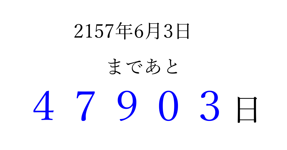 2157年6月3日(金)まで あと 99999 日です 追加すると、トップページからすぐ選べるようになります ※2026/04/08現在の結果です。 最新の状態に更新する ↓シェアして、タイムライン上にカウントダウンを表示しよう!↓ 📤 この結果を共有する Tweet シェア Threads Bluesky 別の日付でカウントダウン 2157年6月のカレンダー このページをブックマークに追加すると、いつでもカウントダウンを確認できます。 (PC: Ctrl+D / Mac: ⌘+D) hitome-notes.comでは以下のページも運営しています。 指定日と期間から日付を計算 | ガチャ確率計算・シミュレーション | プライバシー・ポリシー 運営者:Avocado